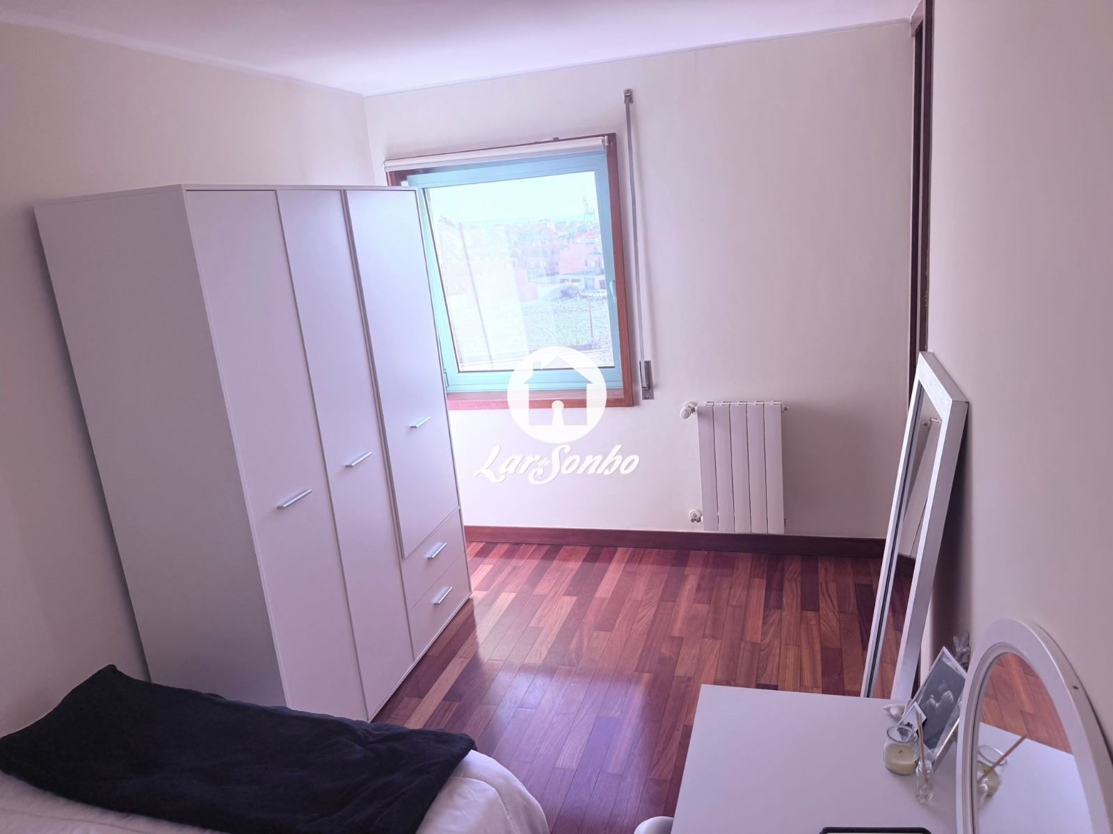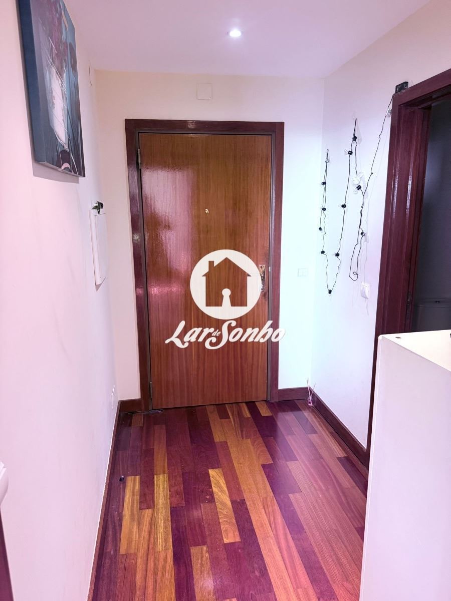 O apartamento apresenta cozinha, sala luminosa (com piso em madeira, zona de refeições e ampla janela com vista sobre a cidade e o mar), quarto com boa área, casa de banho completa e arrumo.