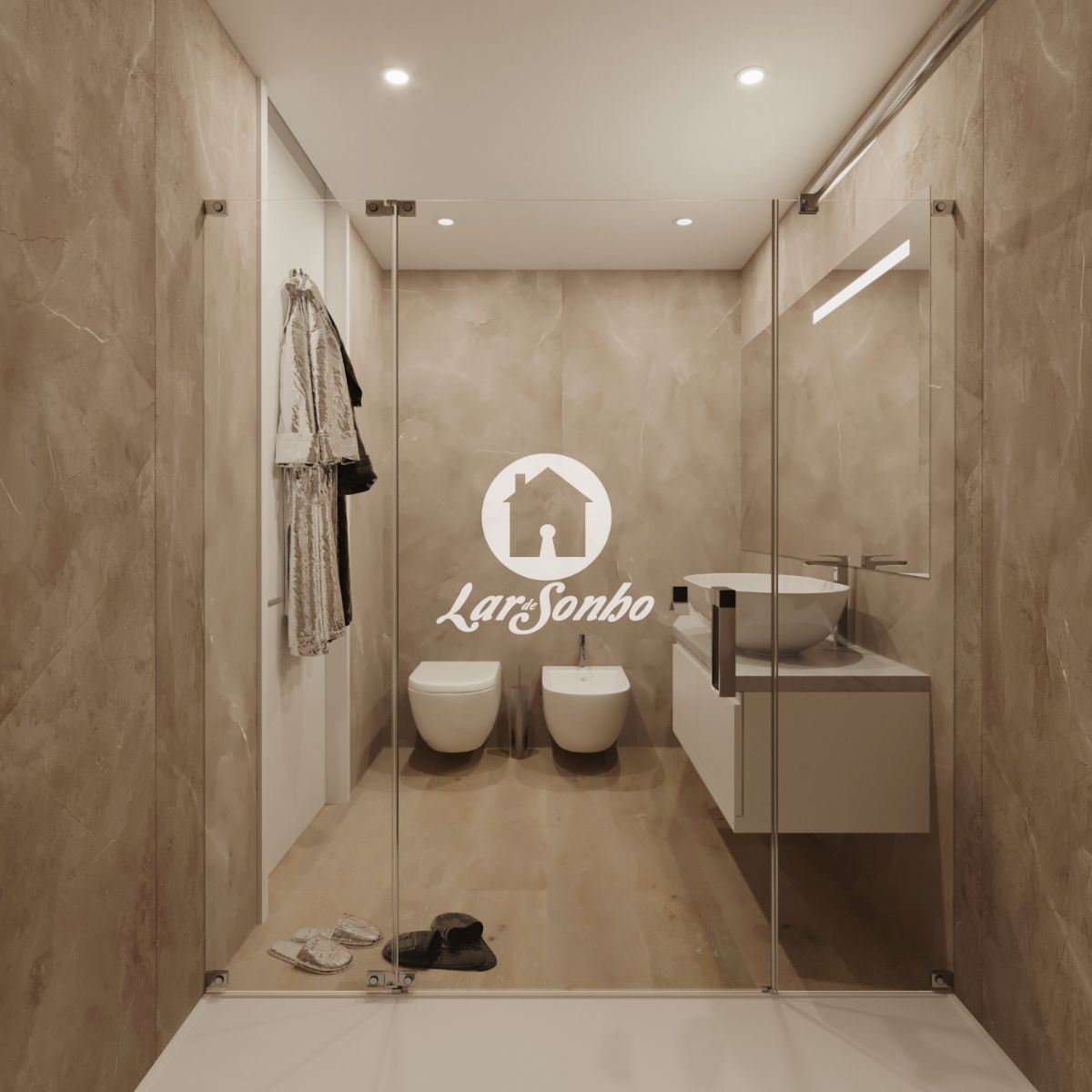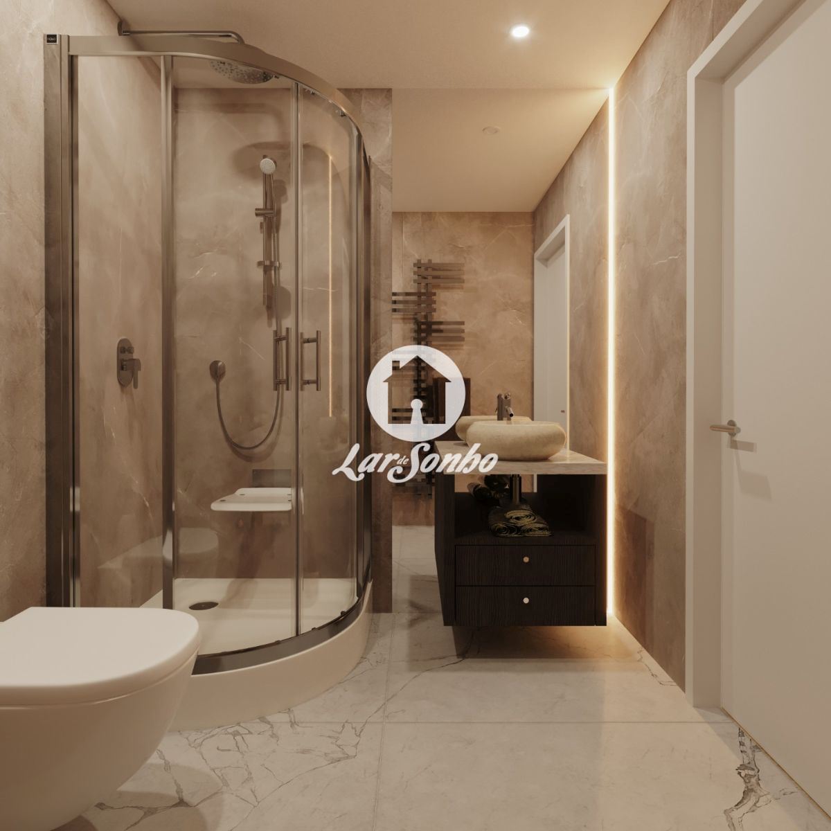 - Casa de Banho: As casas de banho são modernas, com acabamentos de excelência, bancadas em materiais nobres, louças sanitárias de qualidade e uma estética clean e sofisticada.