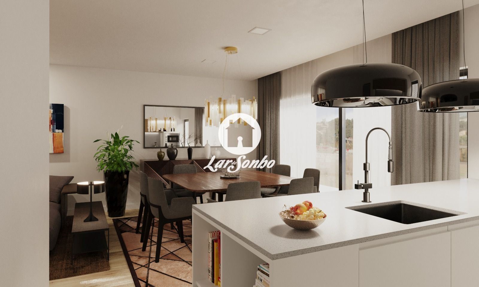 - Sala de Estar e Jantar: O living room, em open space com a cozinha, é um espaço amplo e iluminado, com grandes janelas que permitem uma entrada abundante de luz natural, criando uma atmosfera acolhedora e moderna.