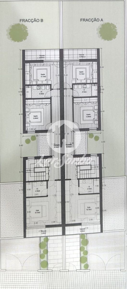 The houses have two floors with generous areas and tree fronts, with east/west sun exposure, set on a 620m2 plot with a patio.