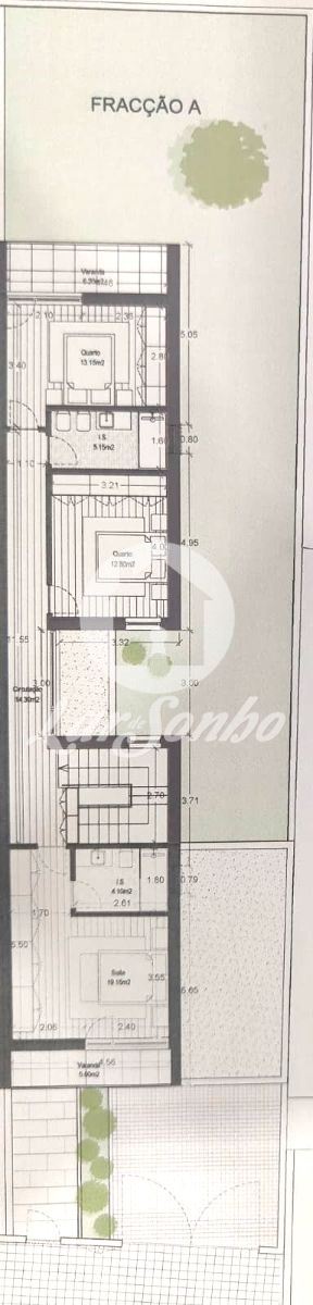 A moradia, com dois andares, com áreas generosas e três frentes, com exposição solar nascente / poente, inserida num lote de 620m2 e com um logradouro.